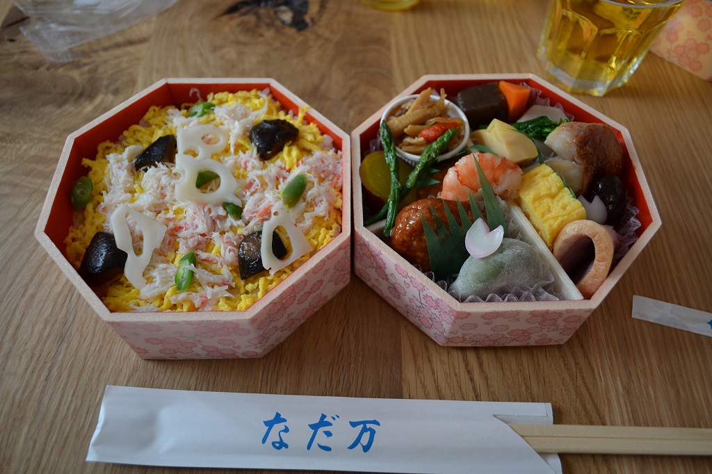 オーナーさんが、なだ万のお花見弁当を用意してくださいました(ごちそうさまでした!)。